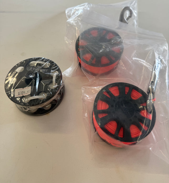 Choice of Spool, either Deep6 with double ender and orange line or Divesoft with white line. All are machined from solid Delrin